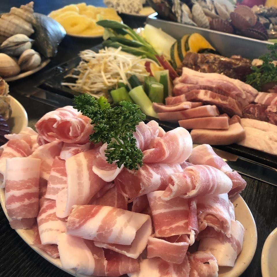 불판이 두개로나뉘어져 있어서 한쪽은 조개찜 끓이고 한쪽은 고기 굽고